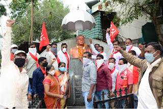 डॉ. बाबासाहेब आंबेडकर यांच्या पुतळ्यास पुष्पहार अर्पण करुन आंदोलनाची सुरुवात करण्यात आली. आंदोलकांनी मोदी प्रणित भाजप सरकारच्या विरोधात जोरदार घोषणाबाजी केली. तर कोरोनाचा गैरफायदा घेऊन शेतकरी, कामगार व जनविरोधी घेतलेली धोरणे रद्द करण्याची मागणी केली.