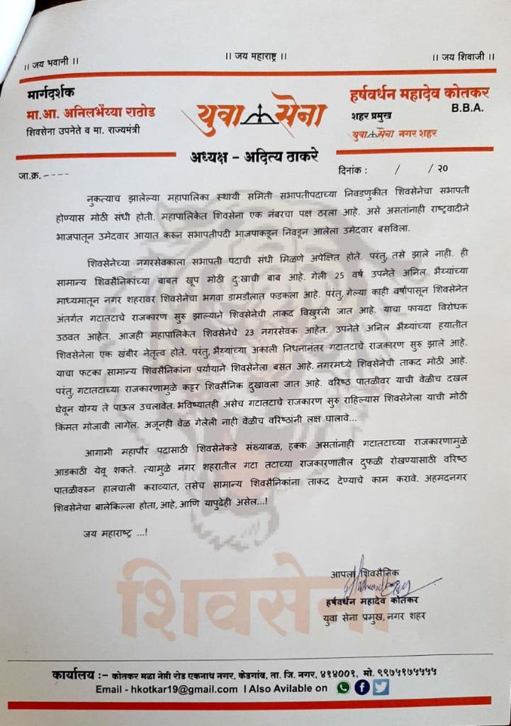 नगर शिवसेनेतील हे गटातटाचे राजकारण मिटावे, यासाठी युवासेनेचे शहरप्रमुख हर्षवर्धन कोतकर यांनी थेट मुख्यमंत्री उद्धव ठाकरे व पर्यावरणमंत्री आदित्य ठाकरे यांना पत्र पाठवले आहे. या पत्रामध्ये त्यांनी महापालिकेत सर्वात मोठा पक्ष ठरलेल्या शिवसेनेला भाजप-राष्ट्रवादीच्या राजकारणामुळे सत्तेपासून दूर राहावे लागले, हे स्पष्ट केले आहे. तसेच शिवसेनेला महापालिकेत विरोधी पक्षनेते पद मिळाले नाही. मनपा स्थायी समितीचे सभापतीपद सुद्धा शिवसेनेला मिळाले नाही, असे म्हंटले आहे. तसेच काही वर्षापासून शिवसेनेत अंतर्गत गटातटाचे राजकारण सुरू झाल्याने शिवसेनेची ताकद विखुरली जात आहे. याचा फायदा विरोधक उठवत आहेत. आजही महापालिकेत शिवसेनेचे २३ नगरसेवक आहेत. माझे कुटुंब-माझी जबाबदारी’ मोहिम तालुकास्तरीय यंत्रणांनी गतिमानतेने काम करण्याची गरज- जिल्हाधिकारी मराठा महिला पदाधिकारी यांचे नगर येथे तहसीलदारांच्या दालनात ठिय्या आंदोलन. केंद्राच्या कृषी कायद्यातील उणीवा दूर करणे गरजेचे- मुख्यमंत्री उद्धव ठाकरे विधानपरिषदेचे विरोधी पक्ष नेते श्री.प्रवीणजी दरेकर यांची सदिच्छा भेट. |